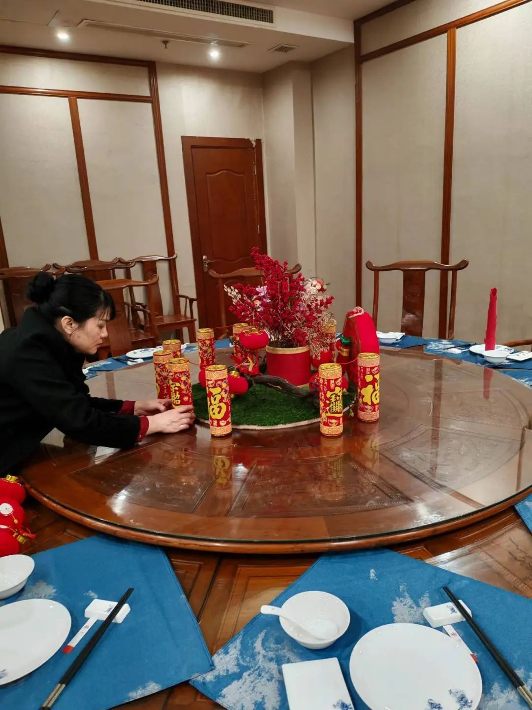 (酒店服務(wù)員為賓客布置年夜飯包廂)