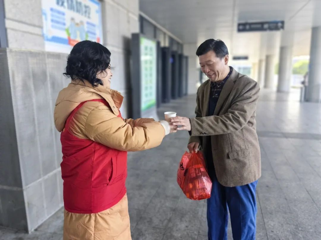 (公交志愿者為乘客遞送茶飲)