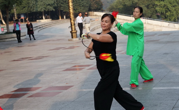 清晨的婁星廣場是廣大市民休閑、娛樂、健身的樂園。有的打太極拳、有的跳廣場舞、有的唱花鼓戲、有的打橋牌、有的以“毛筆”蘸水,以地為紙,筆走龍蛇。大家用手中的相機定格這些幸福、歡樂的場景。照片中市民的“笑顏”里洋溢著滿滿的幸福。