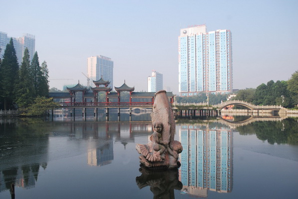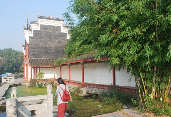公園里迂回的廊橋、飛檐翹角的亭臺樓榭、青墻黛瓦的仿古建筑、從從翠綠的修竹、微泛漣漪的湖水與湖中的倒影深深吸引了大家的眼球。徜徉其中,可謂一步一景,賞心悅目,大家紛紛按動快門。