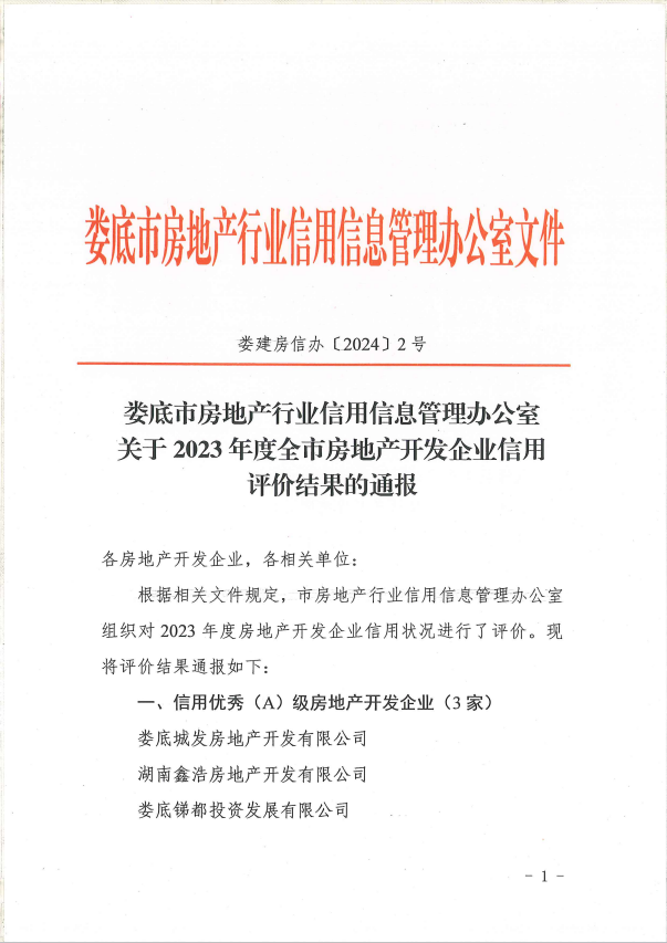 近日,婁底市房地產(chǎn)行業(yè)信用信息管理辦公室發(fā)布2023年度全市房地產(chǎn)開發(fā)企業(yè)信用評價結(jié)果通報,房產(chǎn)公司再度以第1名的成績榮獲信用評價等級“優(yōu)秀”,實現(xiàn)“四連冠”。