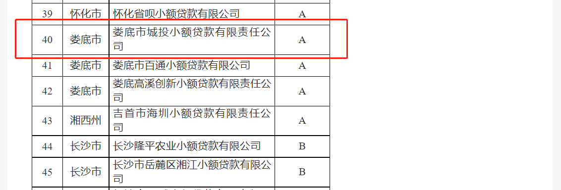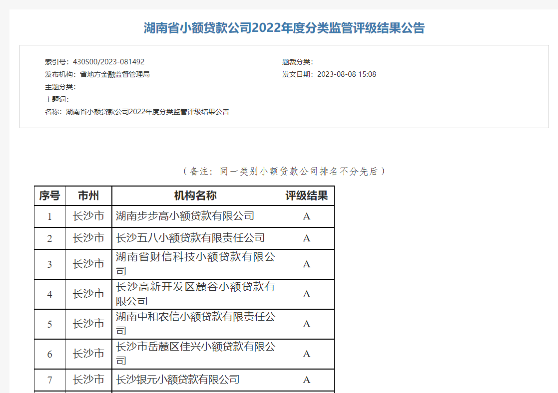 近日,湖南省地方金融監(jiān)督管理局發(fā)布《湖南省小額貸款公司2022年度分類監(jiān)管評級結(jié)果公告》,城投小貸公司榮獲2022年度分類監(jiān)管A類評級,這是城投小貸連續(xù)四年獲得A類評級。